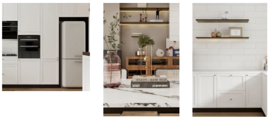 厨房定制白色柜体,沿烹饪动线布局,高度、深度适配操作习惯,下厨更顺畅;柜体内部分层、设抽屉等,锅具、餐具等各有其位,找物高效。墙面定制悬浮置物架带暖光,还预留充电位,柜体暗藏缓冲轨道与分类拉篮,让定制实用优势尽显,兼顾收纳与美学。