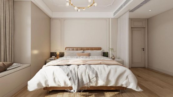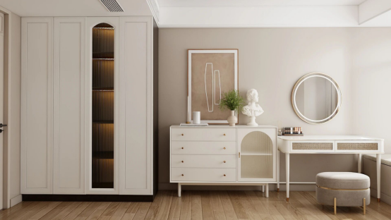 以微暖奶油白贯穿全屋墙面与柜体,弱化空间边界感的同时,赋予环境细腻柔和的质感;搭配浅驼色软装进行层次调和,从布艺家具到装饰细节形成呼应,让温柔氛围渗透到空间每一处。