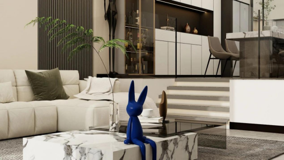 餐厅区域,餐边柜采用“封闭柜体+玻璃酒柜”的组合形式,白色哑光柜体营造极简基调,黑色开放格形成视觉焦点,金色金属边框的玻璃酒柜则如艺术展柜般,将酒品陈列转化为空间装饰元素,在黑白灰的主色调中注入精致感,使餐边柜成为餐厅区域的视觉锚点,与整体空间的现代风格形成呼应,同时通过材质与色彩的对比,构建出富有层次的视觉节奏。