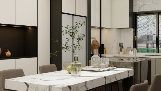 厨房柜体的设计是“美学表达”与“功能落地”的结合体,既以简约高级的视觉呈现契合现代家居审美,又以精细化的收纳与布局,为日常烹饪、用餐提供高效且舒适的体验,最终让餐厨空间成为家的 “质感生活容器”。