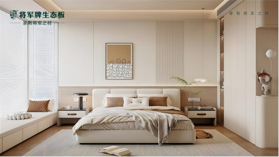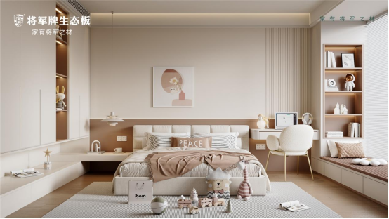 将军牌生态板的浅原木纹理,是儿童房空间的灵魂所在,搭配清爽通透的白色柜体,两种色调碰撞出治愈感满满的视觉体验,既不沉闷也不单薄,让儿童房始终保持明亮开阔的质感;当阳光透过窗帘洒入时,原木色书桌、衣柜泛出柔和暖光,白色面板折射出细碎光影,在墙面与地面形成灵动光斑,孩子追逐光斑嬉戏、趴在书桌涂鸦,光影与木色交织的瞬间,便是童年珍贵的画面,这种低饱和配色契合儿童房清新调性,更能适配孩子成长过程中的软装变化,多年后依然不会过时。