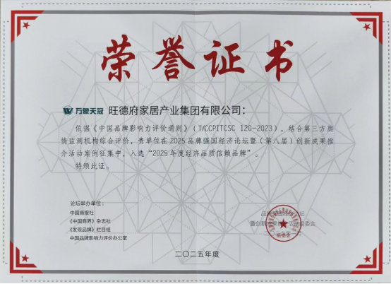 凭借在家居建材行业的持续深耕与突破性创新实践,旺德府家居集团及旗下核心品牌万象板材、万象天冠高端实木全屋定制,从众多参选企业中脱颖而出,一举摘得品牌强国“2025年度智能制造标杆企业”、“2025年度创新(板材行业)十大国民优选品牌”、“2025年度经济品质信赖品牌”三项重磅荣誉,为集团高质量发展的品牌进阶之路再添浓墨重彩的一笔。