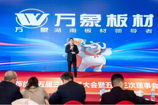 常规议程后,年会进入重磅分享环节。旺德府集团大客户业务中心总经理汤科应邀登台,深情回顾了万象板材深耕行业二十七载的发展历程,全面介绍品牌旗下高端板材、高端辅材两大核心产品矩阵,全方位展现品牌硬核产品实力。针对万象天冠高端衣柜定制的“四化” 体系,汤科总经理进行了专业、细致的深度解读,帮助现场同仁进一步深化对万象品牌产品体系与服务能力的认知。