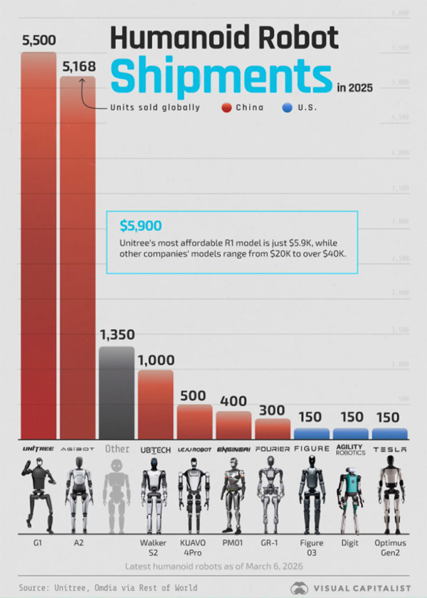 从企业出货量份额来看,中国企业表现突出。根据中国电子报发布的《2025年人形机器人市场研究报告》,宇树科技(Unitree)出货量和市场份额在全球排名第一,2025年出货量超过5500台。此外,宇树科技的产品在技术上也位居世界前列,价格也相对亲民。例如,其最便宜的R1型号售价仅为5900美元,而该公司还出售售价1600美元的机器狗。